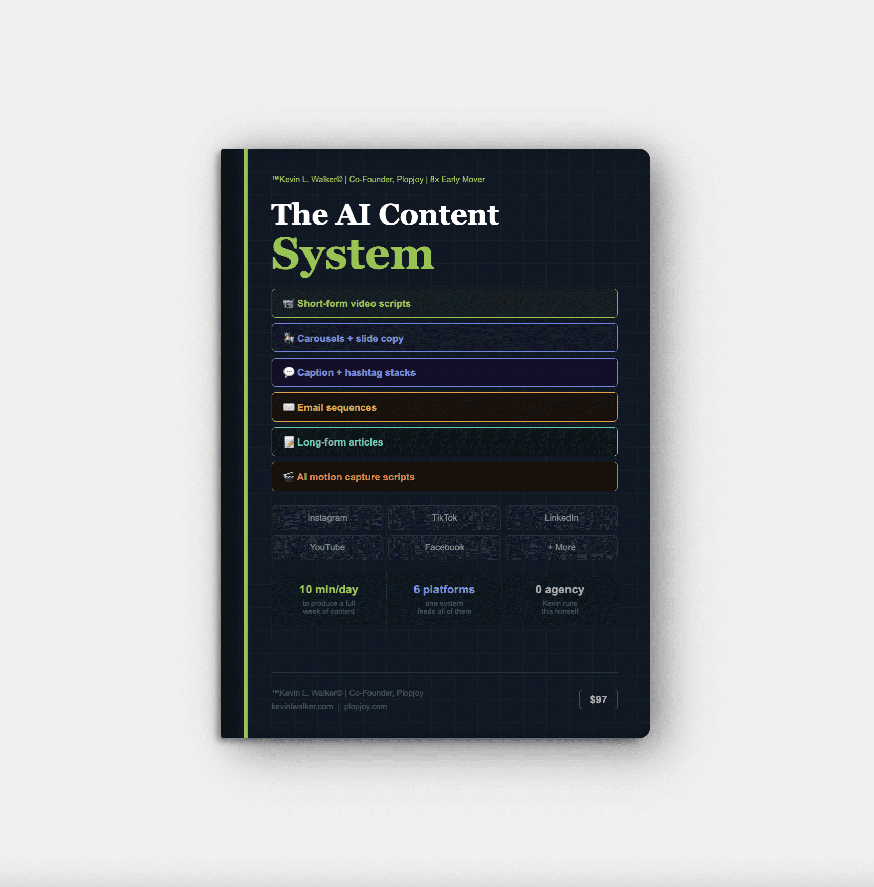 A Note From Kevin: “I have over 673,000 followers built entirely organically. Not because I post all day — because I have a system. This is the system. I built it, Plopjoy uses it for clients, and it works at every level from solopreneur to 100-person operation.” — Kevin L. Walker · 8X Early Mover · $3M+ Career Revenue · Founder, Plopjoy